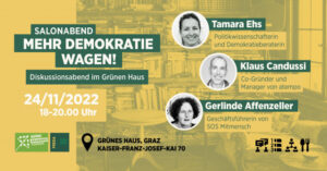 Der Salon ist eine gemeinsame Veranstaltung von FREDA – Die Grüne Zukunftsakademie und Grünen Akademie Steiermark und ist ein regelmäßig stattfindender Diskussionsabend zu Themen aus Kunst, Kultur und Politik.